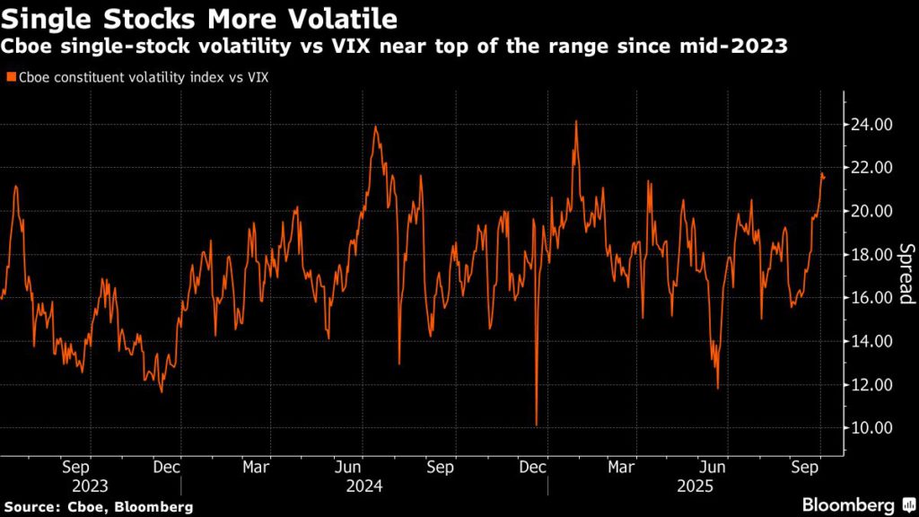 « La propagation entre un seul groupe Vol et Index Vol s'est élargie dans une faible corrélation impliquée par SPX et une dispersion élevée », a écrit Tanvir Sandhu, stratège en chef des dérivés mondiaux chez Bloomberg Intelligence, dans une note la semaine dernière.