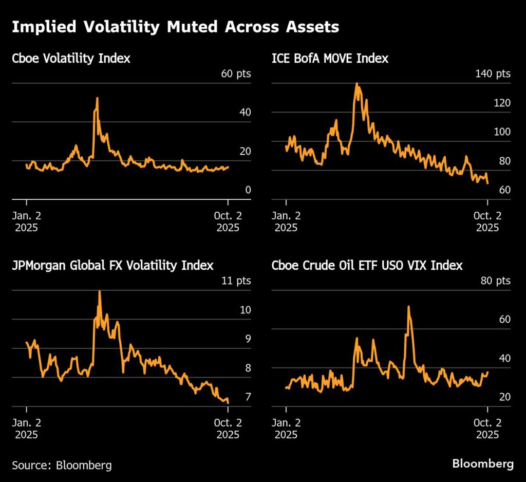Dans les actions, le volume des options a atteint un record en septembre, et les attentes des mesures de marché ont quelque peu augmenté à mesure que les investisseurs commencent à ajouter des haies vers la fin de l'année. Mais il n'y a que beaucoup de commerçants paieront pour des options si les balançoires réalisées restent limitées.